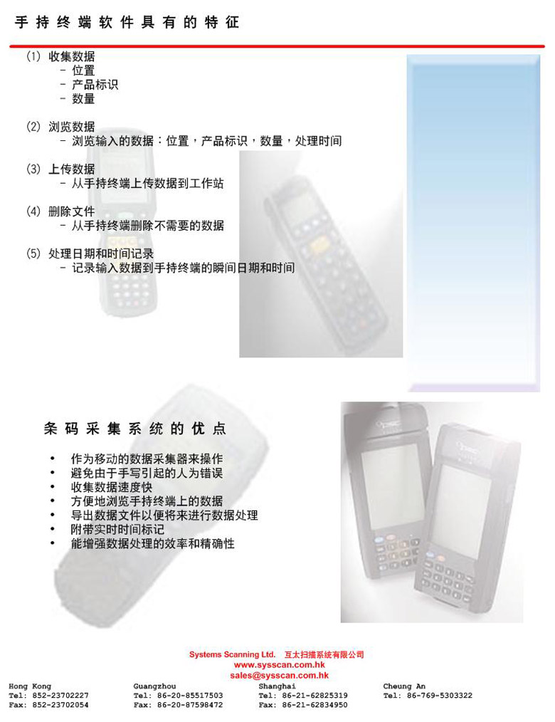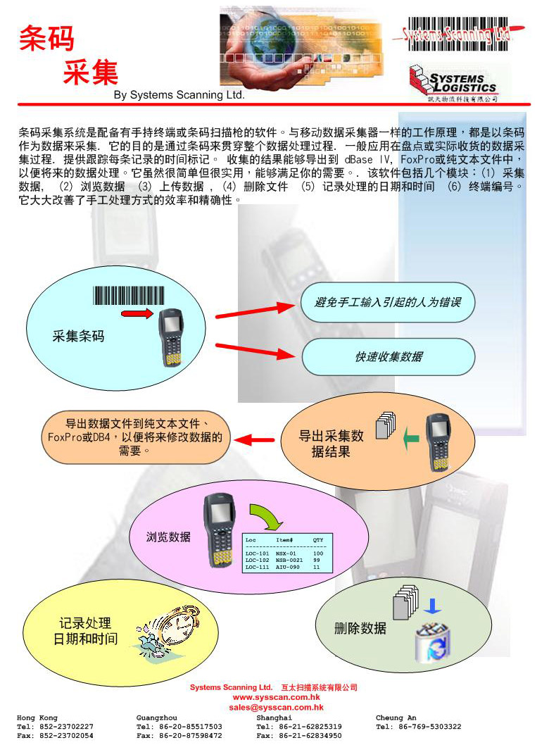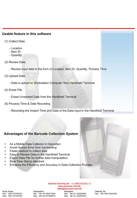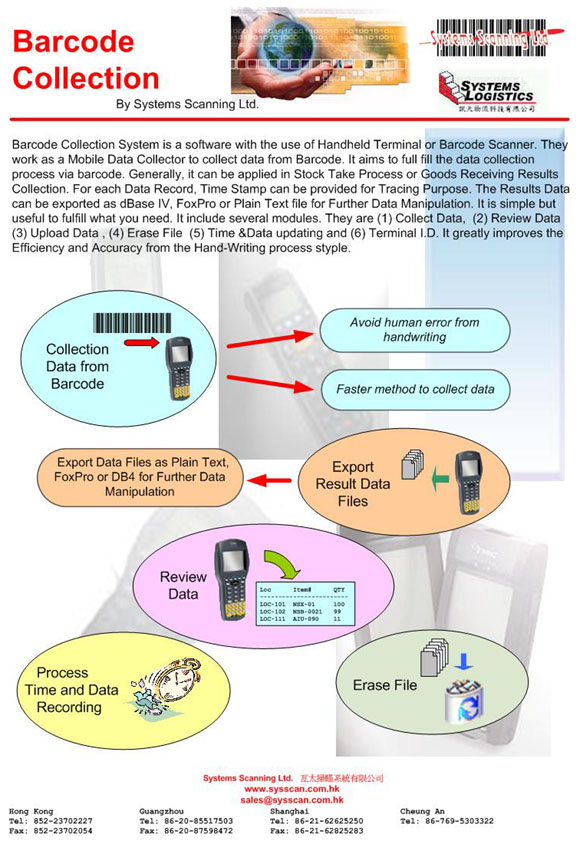 "Barcode Collection System" is a software with the use of Handheld Terminal or Barcode Scanner. They work as a Mobile Data Collector to collect data from Barcode. It aims to full fill the data collection process via barcode. Generally, it can be applied in Stock Take Process or Goods Receiving Results Collection. For each Data Record, Time Stamp can be provided for Tracing Purpose. The Results Data can be exported as dBase IV, FoxPro or Plain Text file for Further Data Manipulation. It is simple but useful to fulfill what you need. It include several modules. (1) Collect Data (2) Review Data (3) Upload Data (4) Erase File (5) Time & Date Stamp (6) Terminal I.D. Capturing It greatly improves the Efficiency and Accuracy from the Hand-Writing process style. ¡@ |