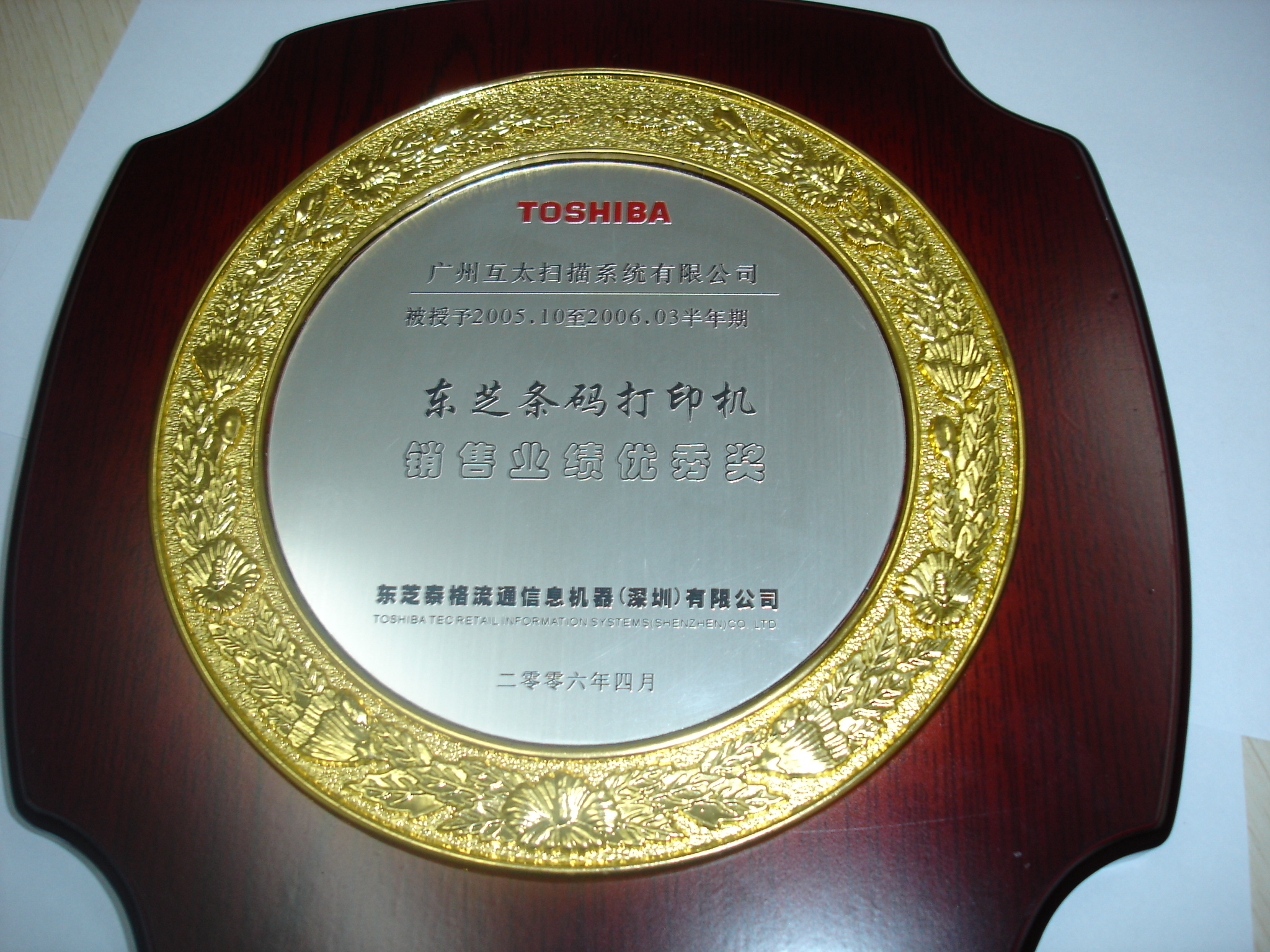 2006/04/01----->广州互太扫描系统有限公司被授予2005.10--2006.3下半年度东芝条码打印机销售业绩优秀奖!!(图)