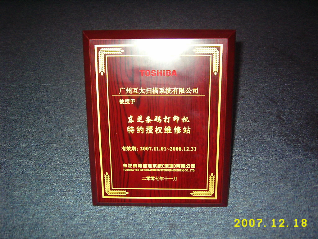 ----->广州互太扫描系统有限公司被授予东芝条码打印机特约授权维修站